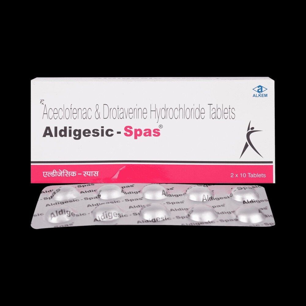 Aldigesic Spas Tab (Aceclofenac + Drotaverine) is a combination medication used to relieve mild to moderate pain and spasms. It works by reducing inflammation and relaxing muscles. While generally safe, it can cause side effects like gastrointestinal upset. Always follow your doctor’s instructions and inform them of any pre-existing conditions, especially liver or kidney issues. Avoid alcohol and driving if affected by drowsiness. This information is for guidance only; always consult a healthcare professional for diagnosis and treatment.