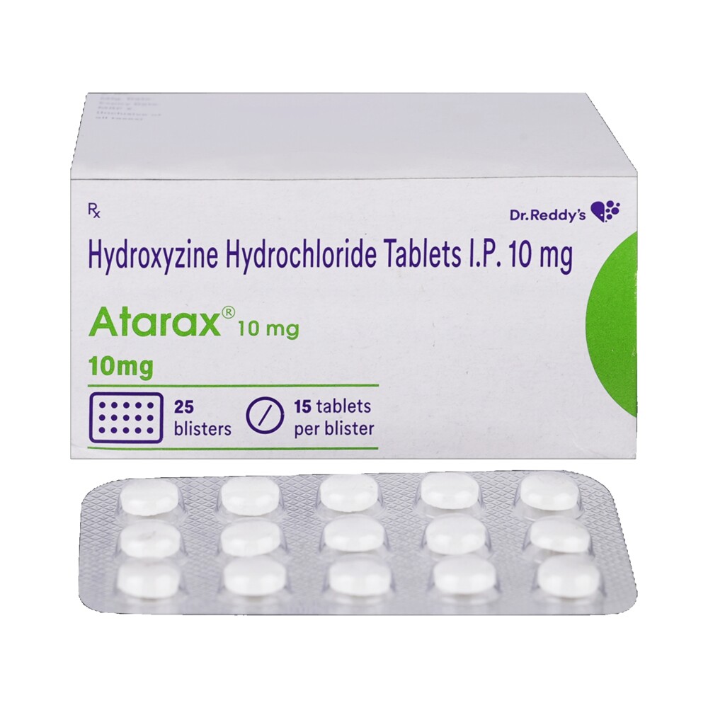 Atarax tablet is an anti-allergic medicine. It is used for the management of allergic skin conditions such as pruritus, urticaria and eczema. Atarax helps in improving symptoms such as itching, swelling, redness, rashes and scaly and patchy skin. It contains hydroxyzine as an active ingredient. Hydroxyzine works by blocking the action of a substance called histamine, which produces allergies. It should be taken as directed by the doctor and in doses and duration as prescribed. Some common side effects of Atarax tablets are headache, dizziness and drowsiness, but not everybody gets them. These side effects normally go away with time, but if you feel the side effects persist, you should consult your doctor. Discuss with your doctor all the existing medical and medication history.
