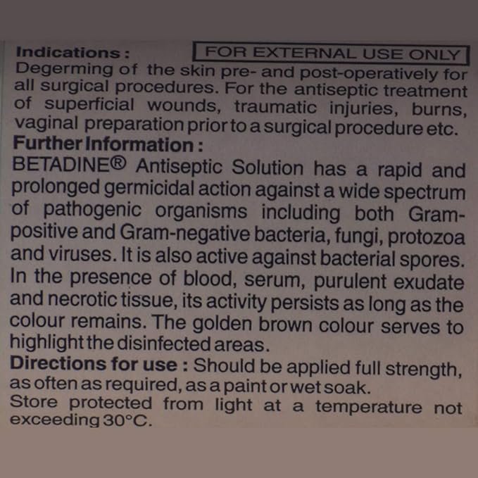 Betadine 10% Solution is for external use only. You should always use it exactly as your doctor has told you. The affected area should be clean and dry before application. You must wash your hands thoroughly before and after applying this medicine. This medicine should be used regularly to get the most benefit from it. Do not use more than you need as it will not clear your condition faster and some side effects may be increased. You can help this medication work better by keeping the affected areas clean.