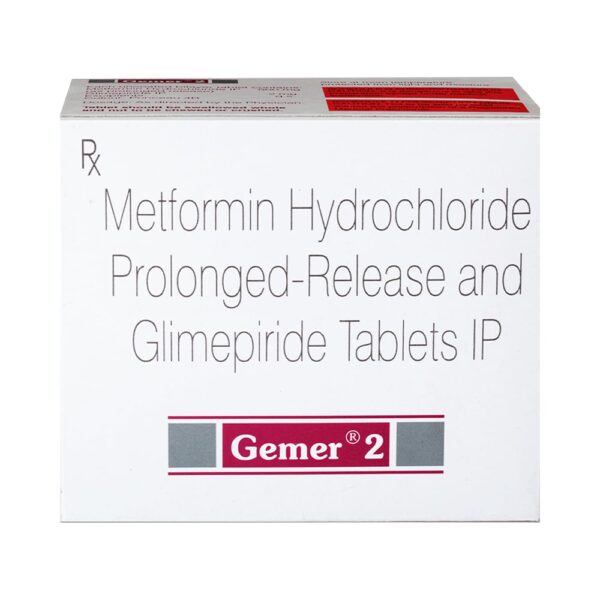 Gemer 2 Tablet PR is a combination of two antidiabetic medicines: Glimepiride and Metformin. Glimepiride is a sulfonylurea that works by increasing the amount of insulin released by the pancreas to lower the blood glucose. Metformin is a biguanide that works by lowering glucose production in the liver, delaying glucose absorption from the intestines, and increasing the body’s sensitivity to insulin.
