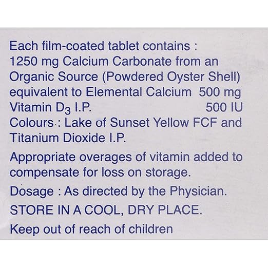 - 1250 mg Calcium Carbonate from an Organic Source (Powdered Oyster Shell) equivalent to Elemental Calcium 500 mg, Vitamin D P 500 IU, Colours: Lake of Sunset Yellow FCF and Titanium Dioxide IP