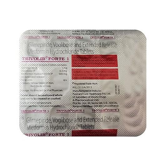 Trivolib Forte 1 Tablet ER is a combination of three antidiabetic medicines: glimepiride, metformin, and voglibose. They work by different mechanisms to provide better control of blood sugar when single or dual therapy is not effective. Glimepiride is a sulfonylurea that works by increasing the amount of insulin released by the pancreas to lower the blood glucose. Metformin is a biguanide that lowers glucose production in the liver, delays glucose absorption from the intestines, and increases the body’s sensitivity to insulin. Voglibose is an alpha-glucosidase inhibitor that prevents the breakdown of complex sugars into simple sugars such as glucose. This prevents the blood glucose levels from rising to very high levels after meals.
